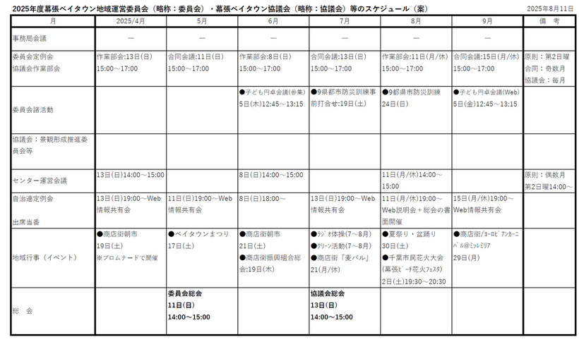 幕張ベイタウン協議会は、ベイタウンの住民、就業者、資産保有者の皆さんの意見を幅広く集め、まとめ、千葉県、千葉市、住宅事業者などに伝える組織として、平成23年6月25日に誕生しました。「幕張ベイタウン」の優れた景観、安全で快適な都市環境及び質の高い都市機能の維持・向上を図ることによって、幕張ベイタウンの住民等会員の共通の利益を増進することを目的としています。